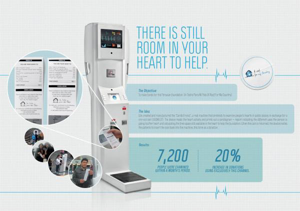To get people to donate money to charity Roof For My Country, Y&R Peru created a machine that looked at your heart. For the price of a coin, "Cardiotronic" looked at your heart and found that you were using it for many things: Forgiving your boyfriend, "liking" stuff on Facebook. But you still had space left over to help the homeless"